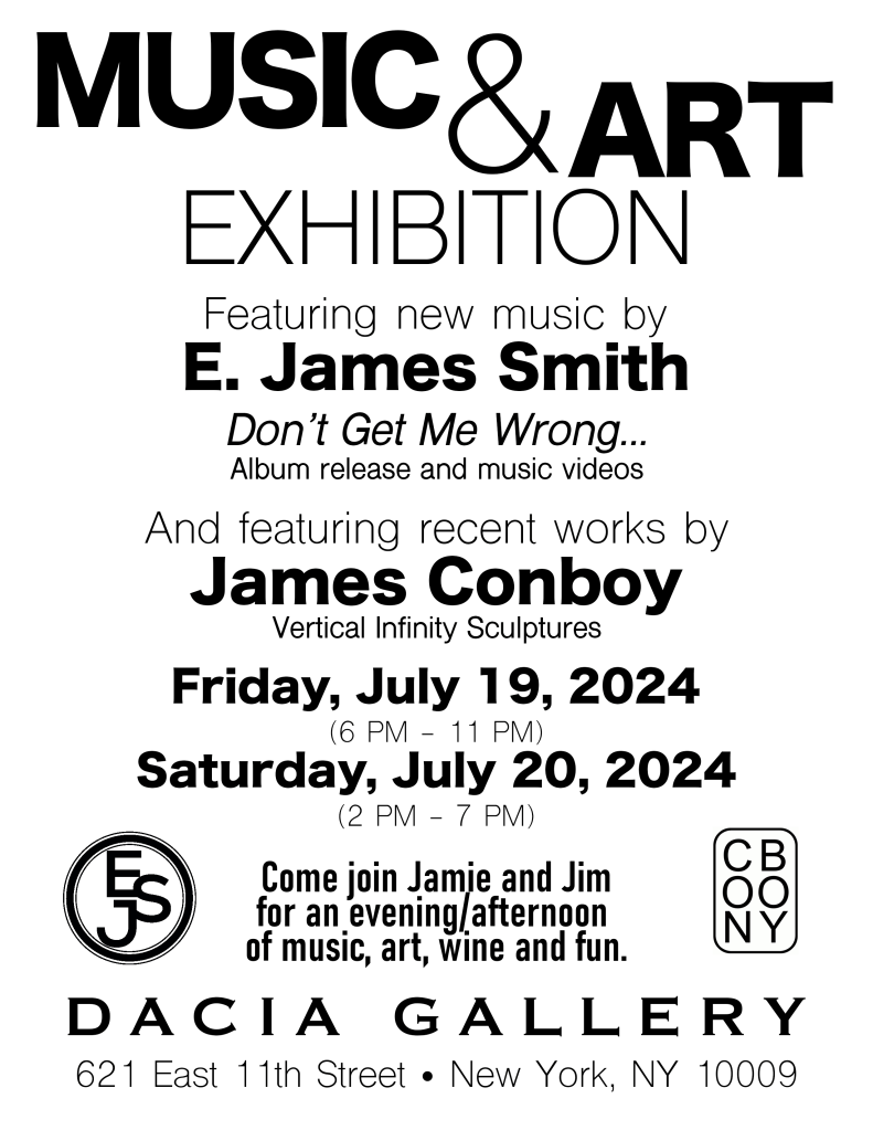 I am thrilled to announce that this Friday my good friend and neighbor, Jim Conboy, and I are presenting my new album, Don’t Get Me Wrong…, and Vertical Infinity Sculptures by Jim in a two-day party at the Dacia Gallery on 621 East 11th Street in Manhattan’s East Village on Friday evening, July 19th and Saturday afternoon July 20th, 2024. All are invited to this free event, especially all our nearby friends on the Eastern Seaboard.