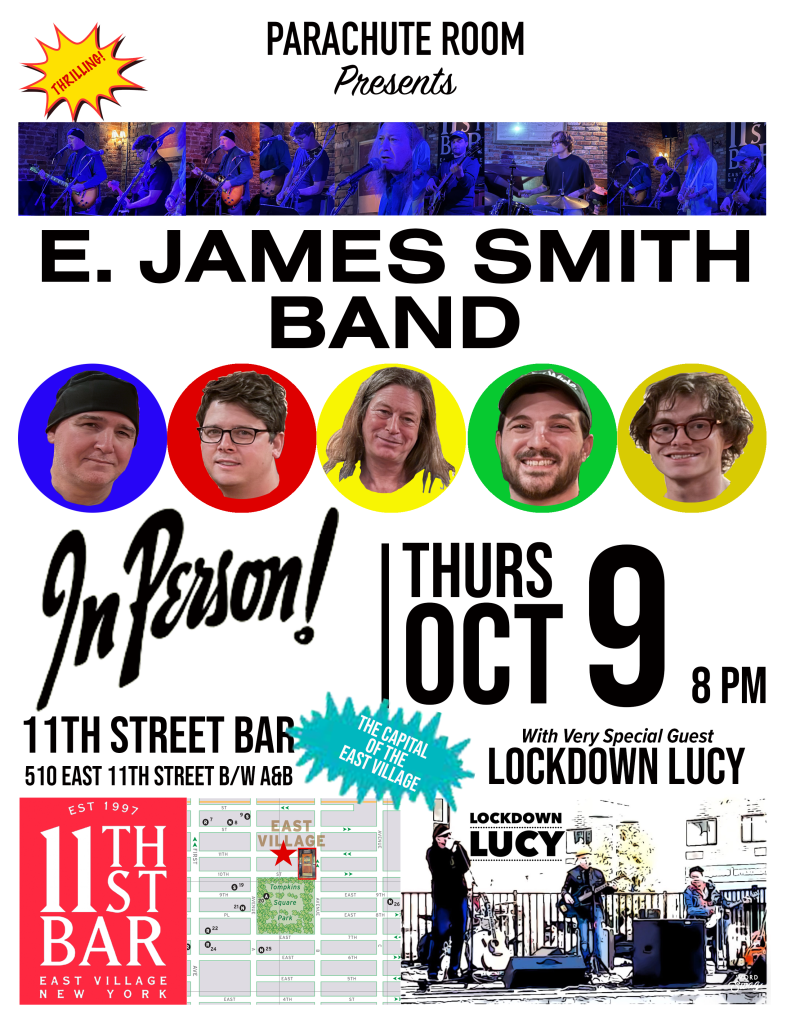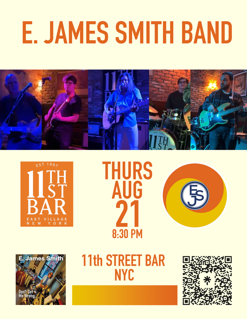 Al, Tim, Pete, Hunter and I are looking forward to our upcoming show on Thursday, June 12th back at our favorite stage at 11th Street Bar in New York City’s East Village. The fun starts at 7:30! More details at https://linktr.ee/ejamessmith.